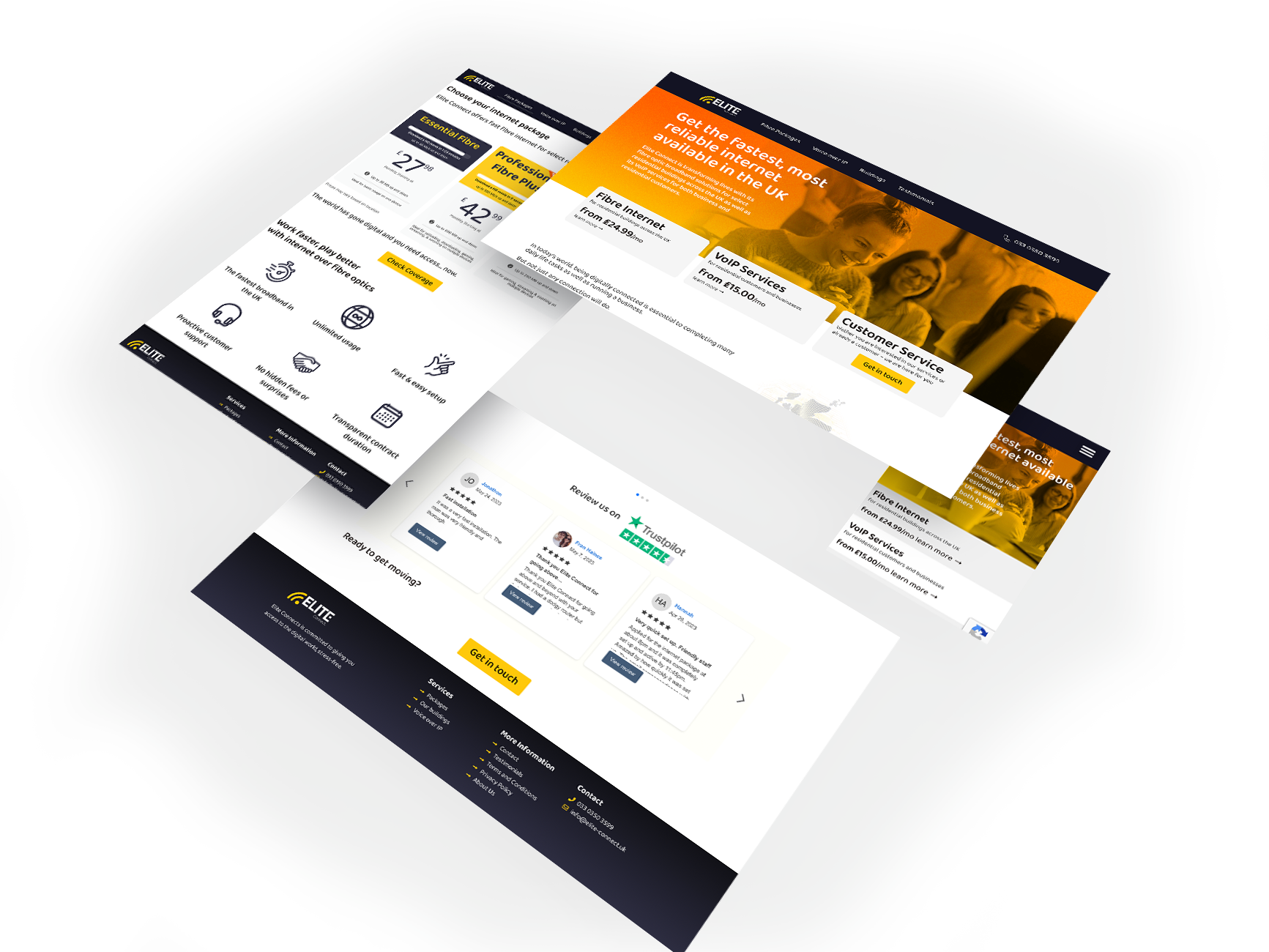 We built a website that showcases Elite's services, such as fibre internet and VoIP. Social proof is presented with testimonial videos and reviews from Trustpilot. There are multiple ways for potential customers to get in touch. The responsive website was designed with Elite's strategic goals in mind.